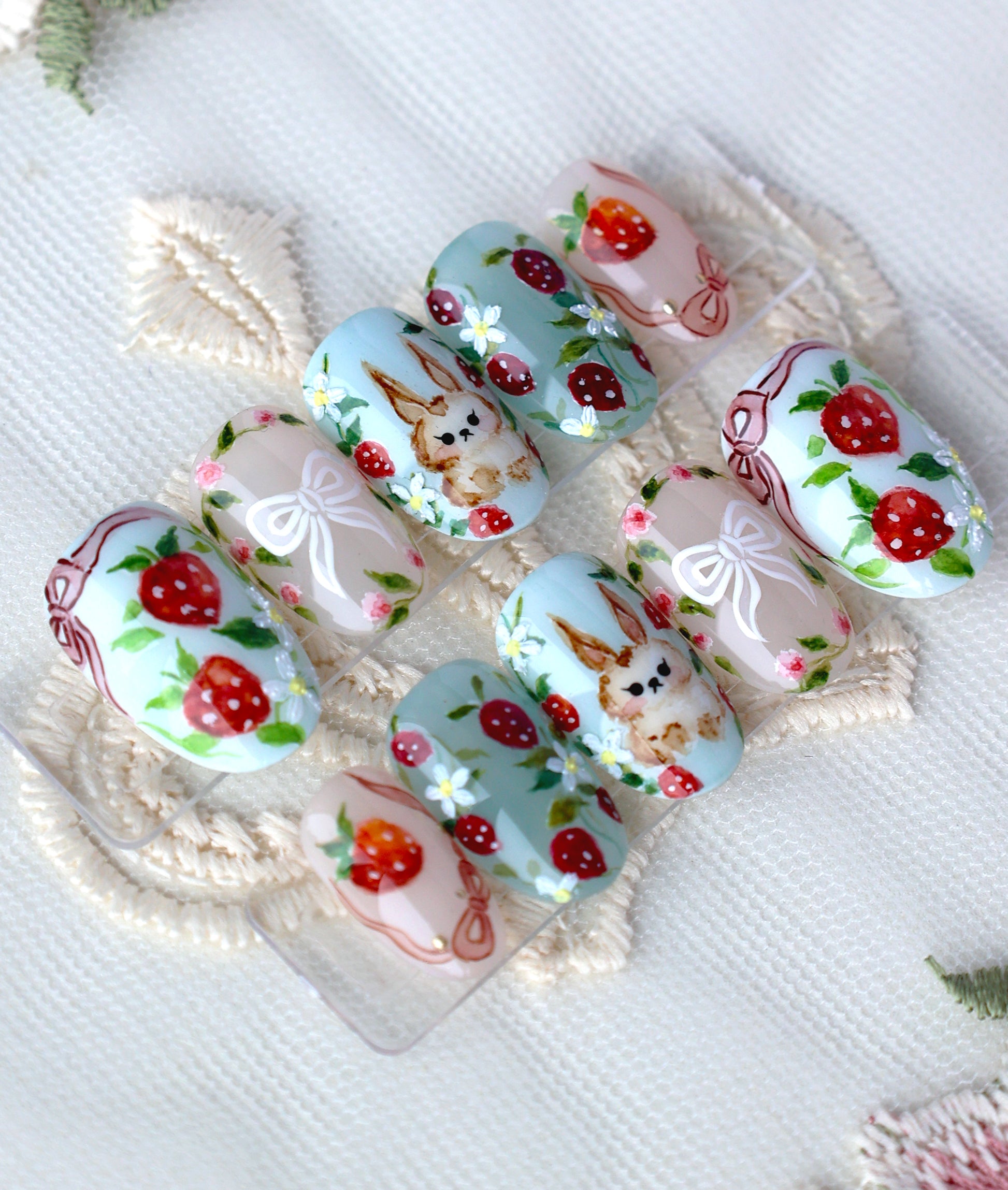 Let’s join the cutest picnic ever! Featuring a fuzzy bunny in a lush juicy strawberry garden, these nails are the definition of coquette cottagecore and the ultimate whimsical look! Hope our cute creation brings a smile to your every day ~