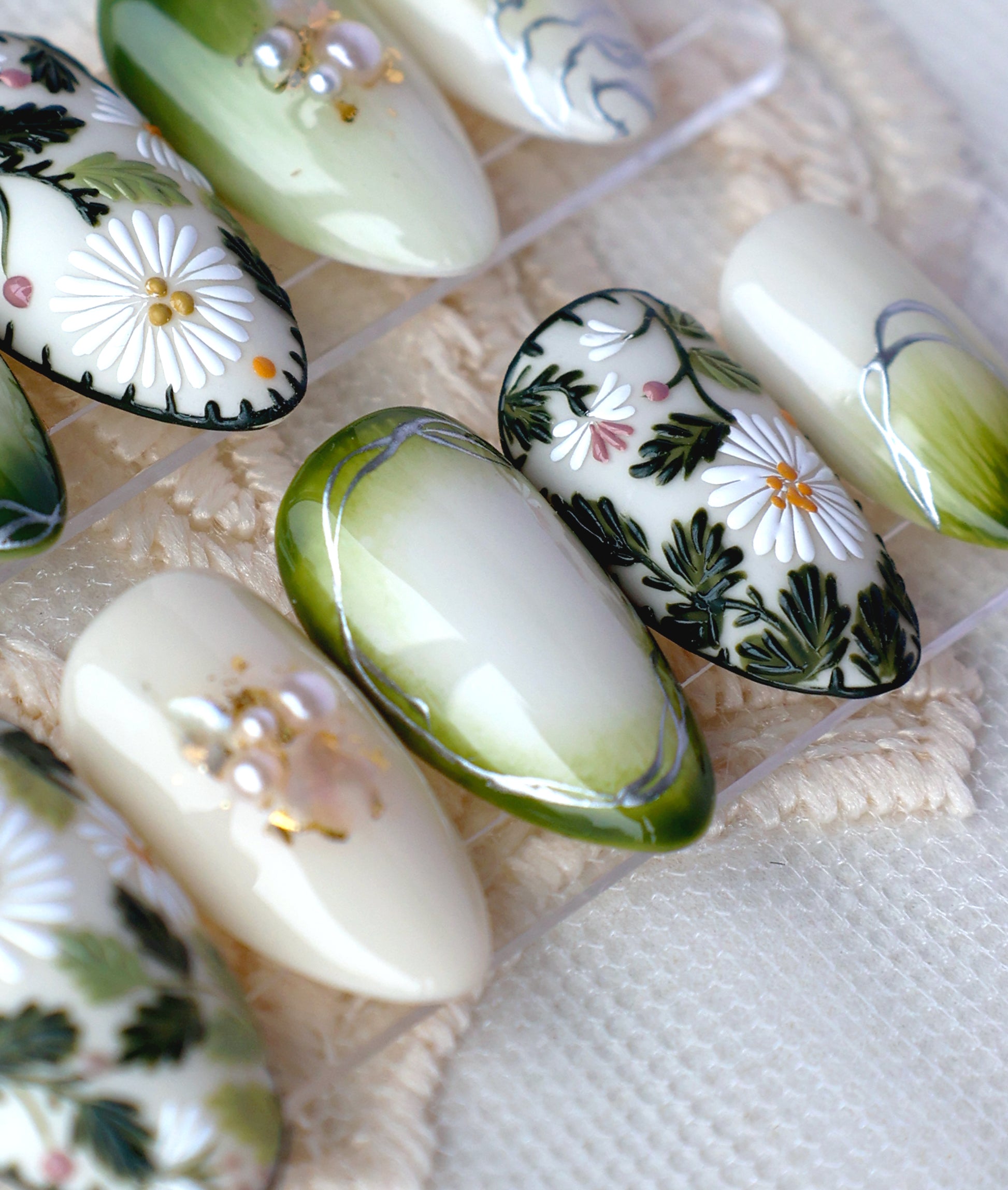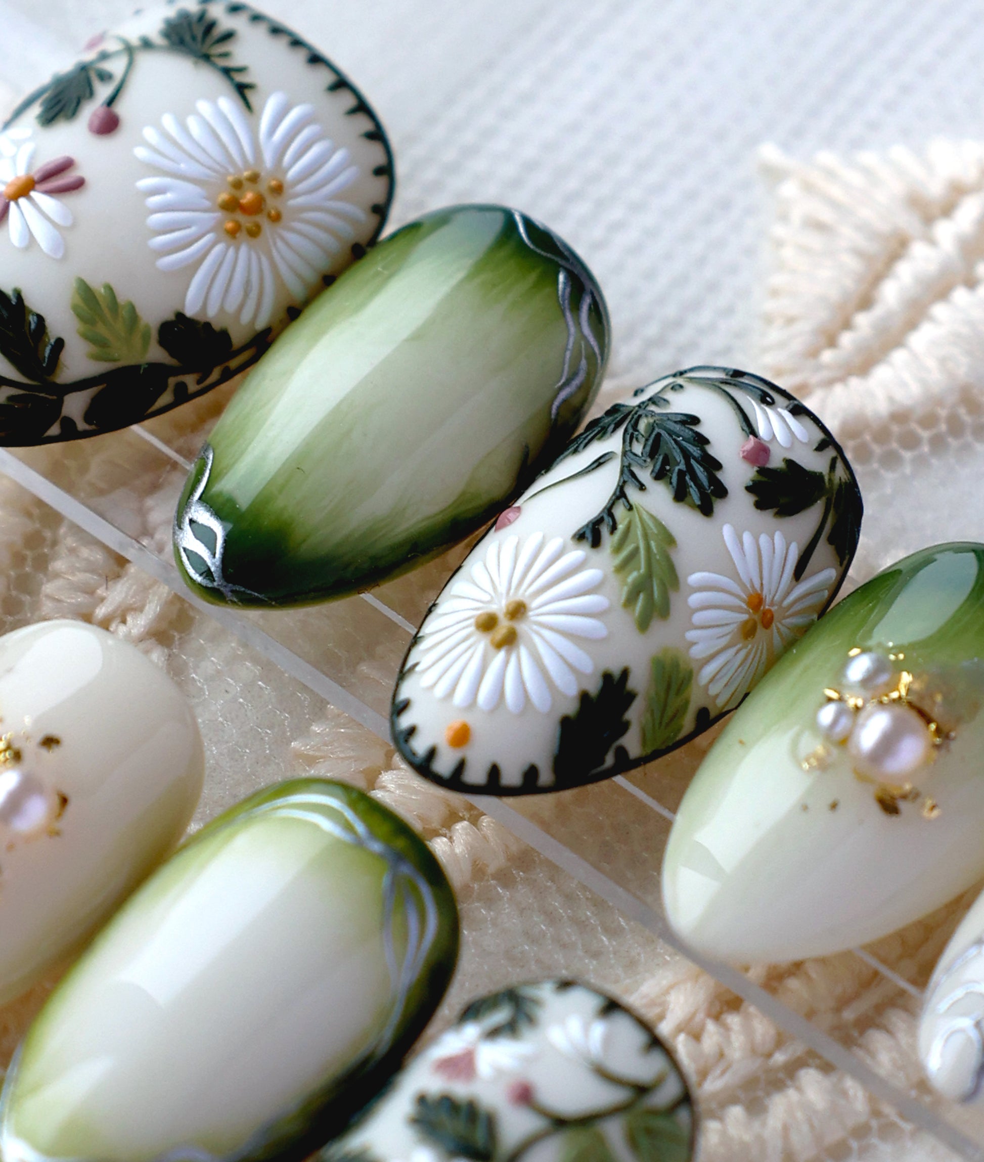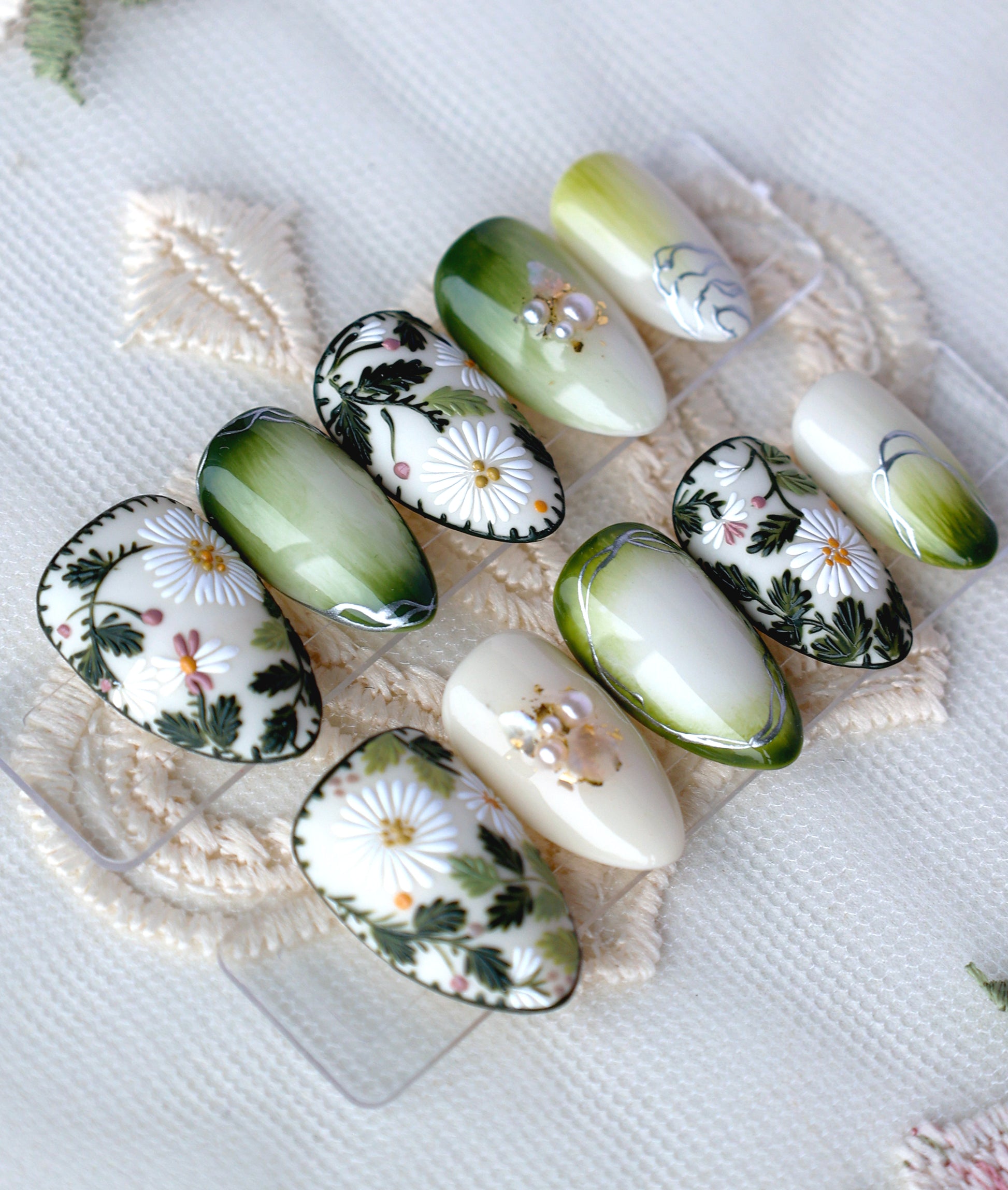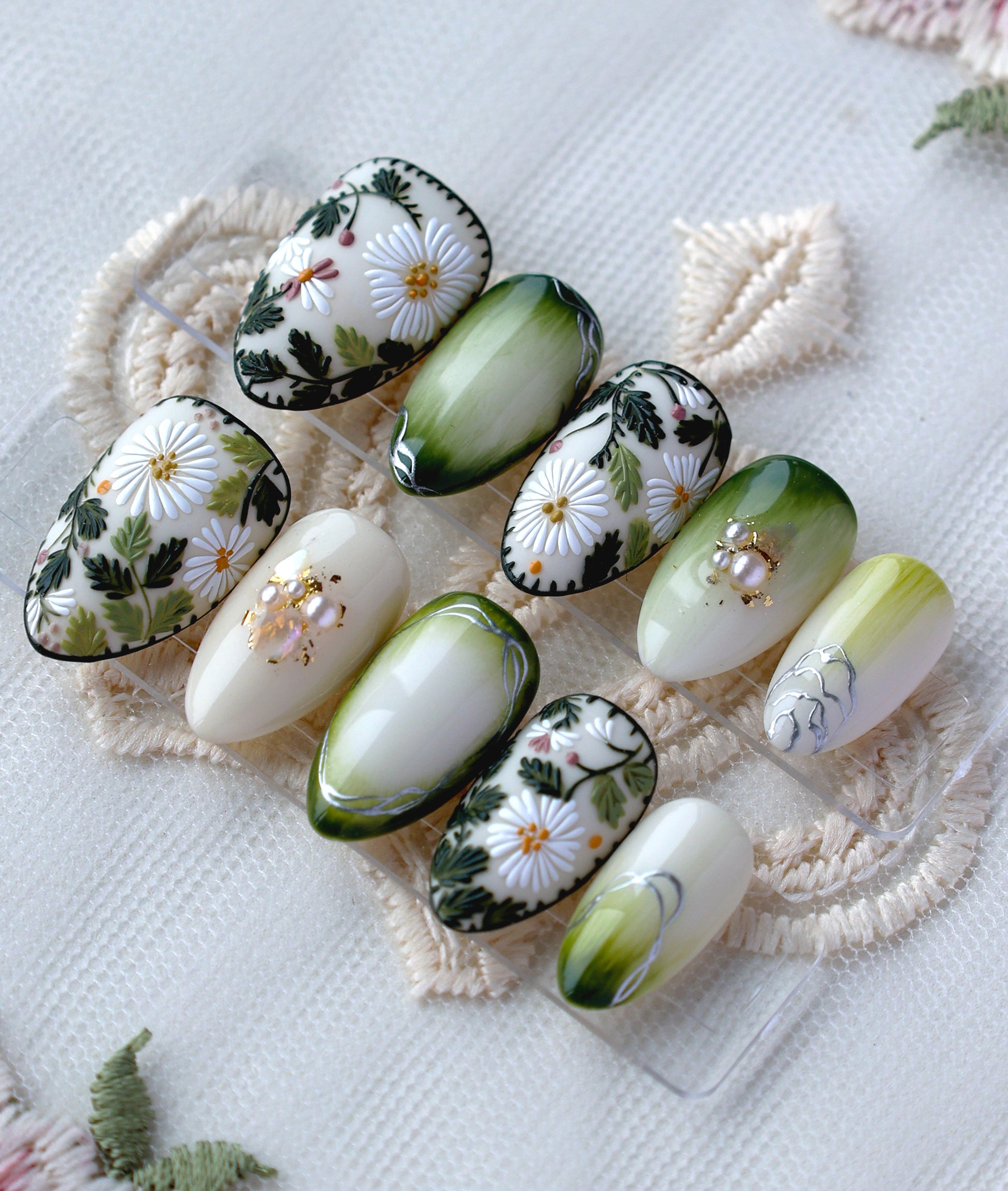 Let the set bring you into a lush, sun-drenched garden! These nails feature striking embroidered daisies that pop against a white and deep mossy-green base. Everything is so cottagecore and gives off cozy slow-living vibes, perfect for those who love nature, countryside or high-art look!