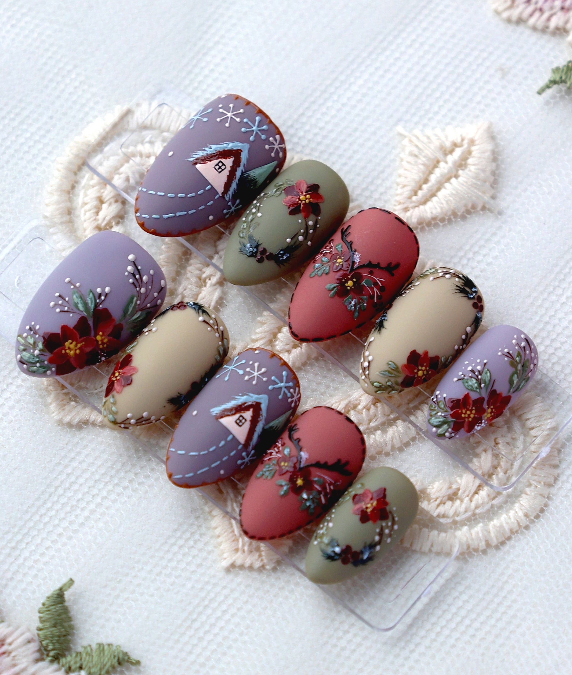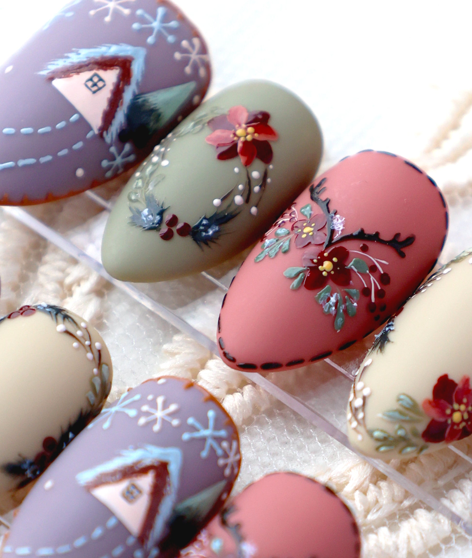 Add a touch of cottagecore charm to your holiday look, and get ready for the coziest Christmas yet!:) This nail set looks just like hand-stitched Christmas embroidery, complete with charming little snowy cabins and delicate floral wreaths. The soft matte colors like sage green and dusty rose give off even more warm vibes!:)