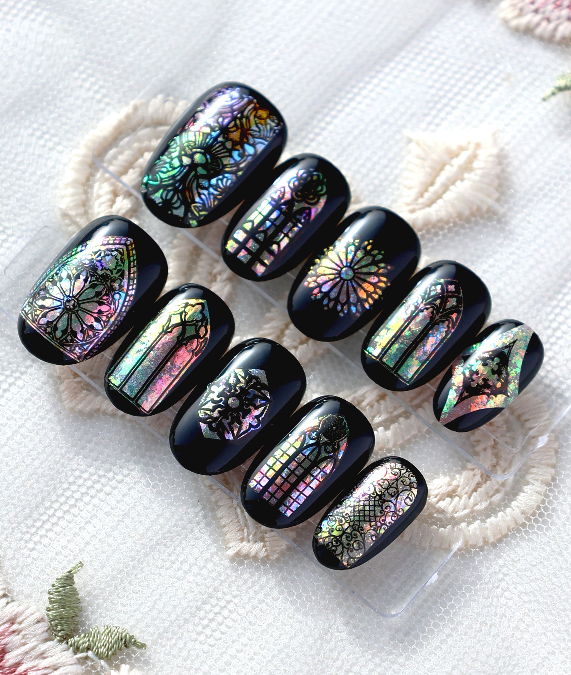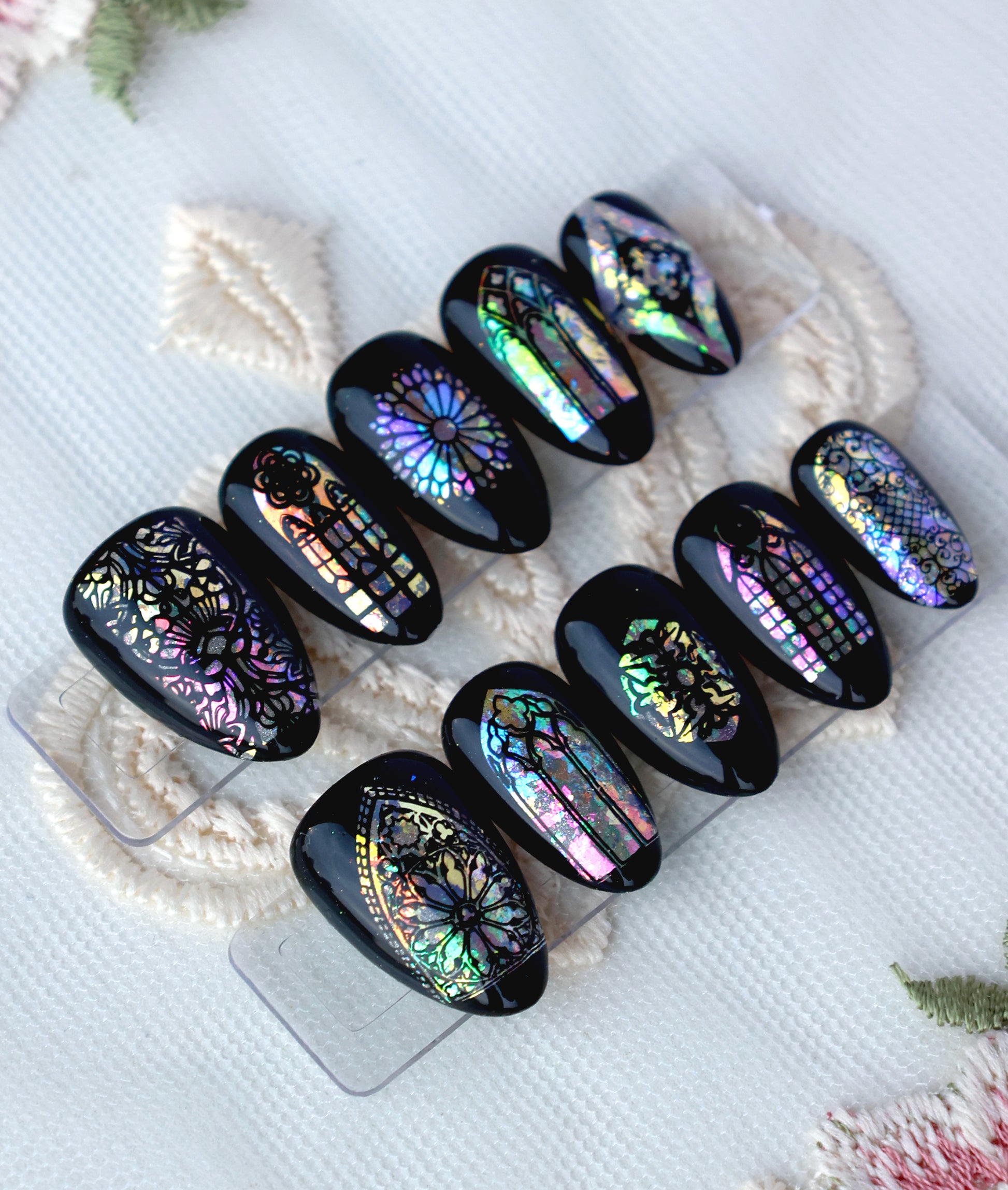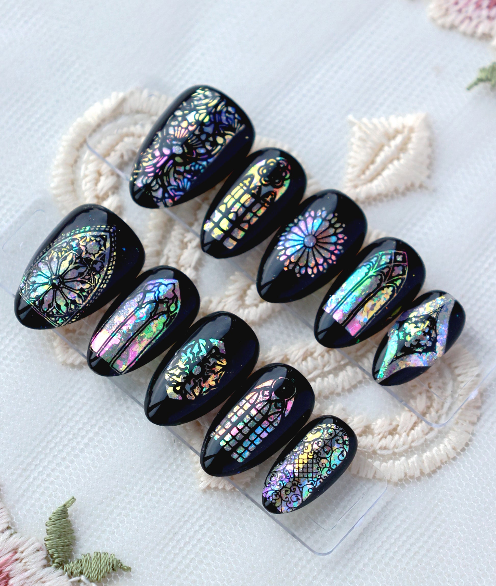 Ready to be mystically glamorous? Featuring glossy black skies with iridescent stained glass windows, this set is like wearing a tiny, magical church, and from colorful archways to beautiful rose designs, everything adds a playful, gothic elegance to your look!:)