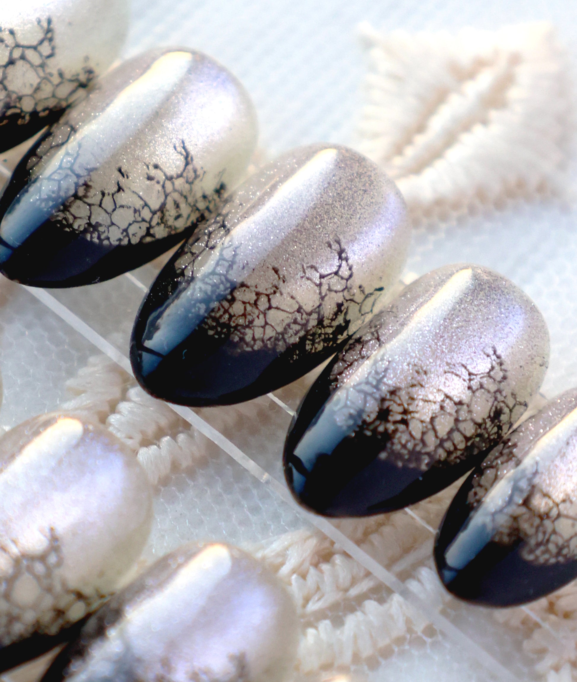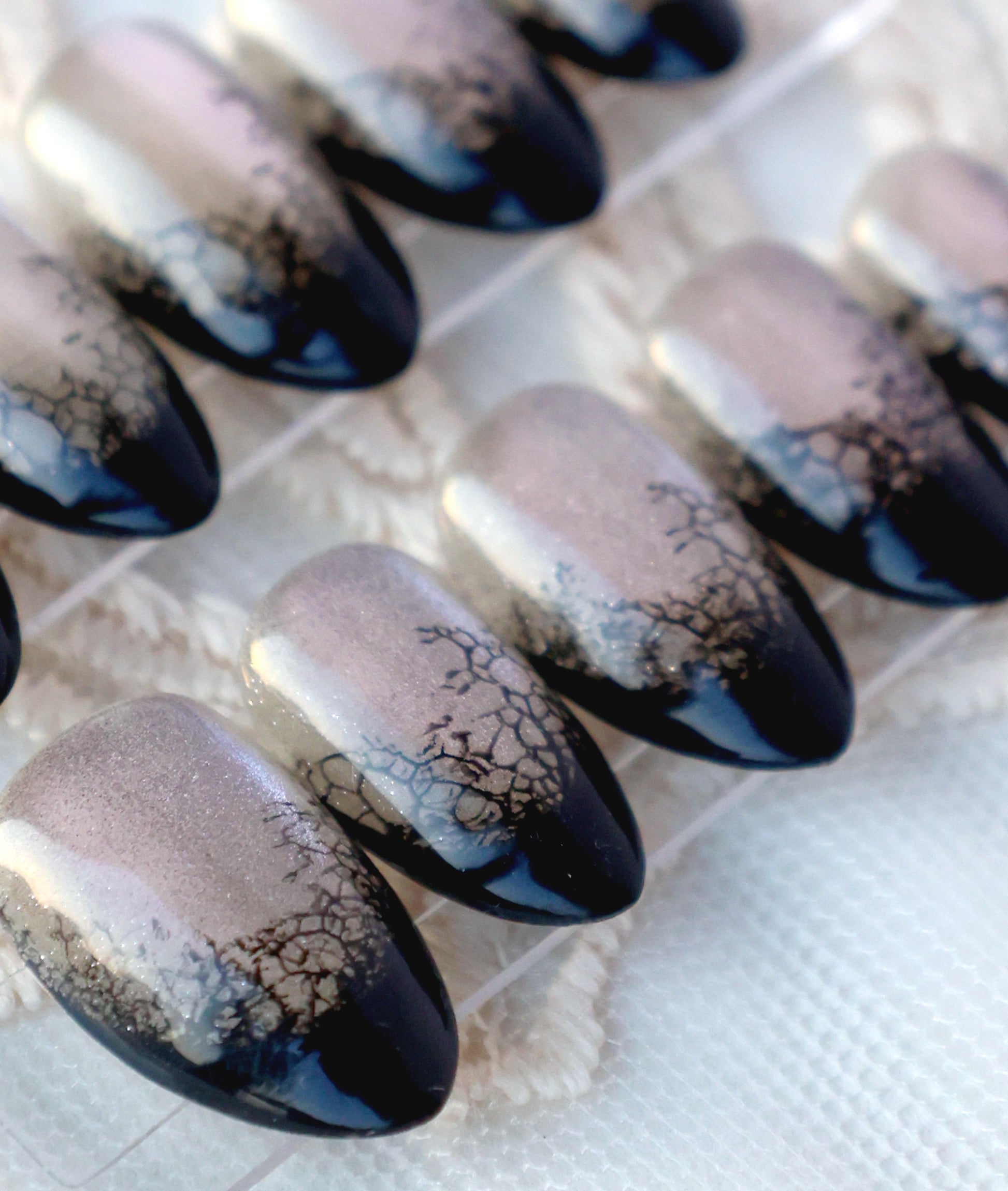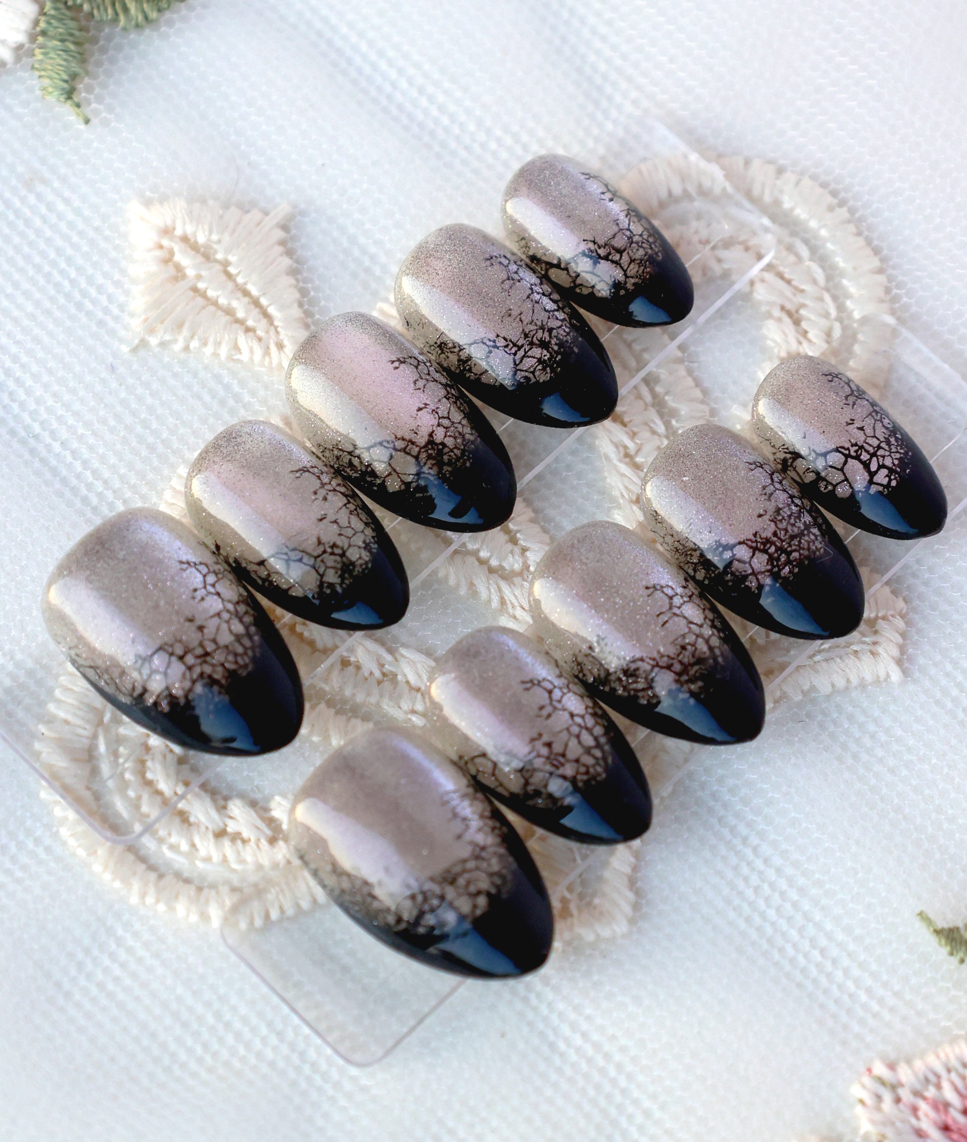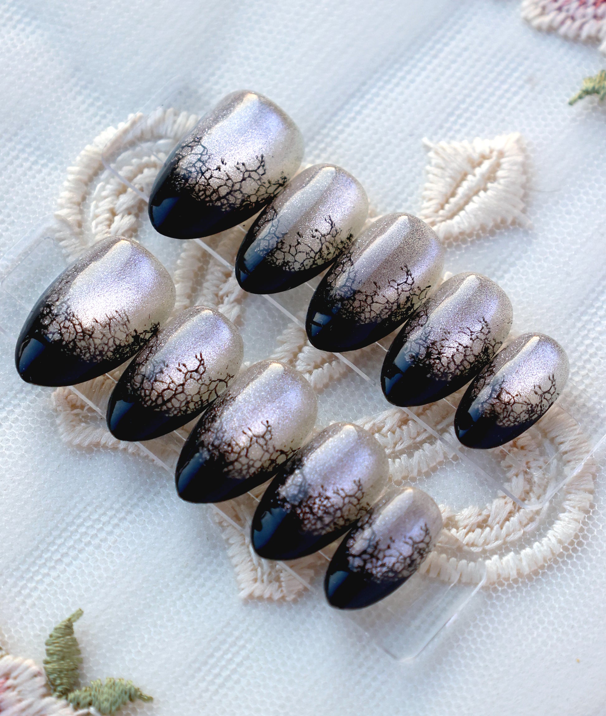 This set is truly a study in shadow and light! It features a luminous smoky grey-silver cat eye base, and the intricate black lacy pattern which sits like a delicate veil over the dark tip. Chic, captivating, and giving a dark elegance edge to your style, making it a powerful statement for any season!