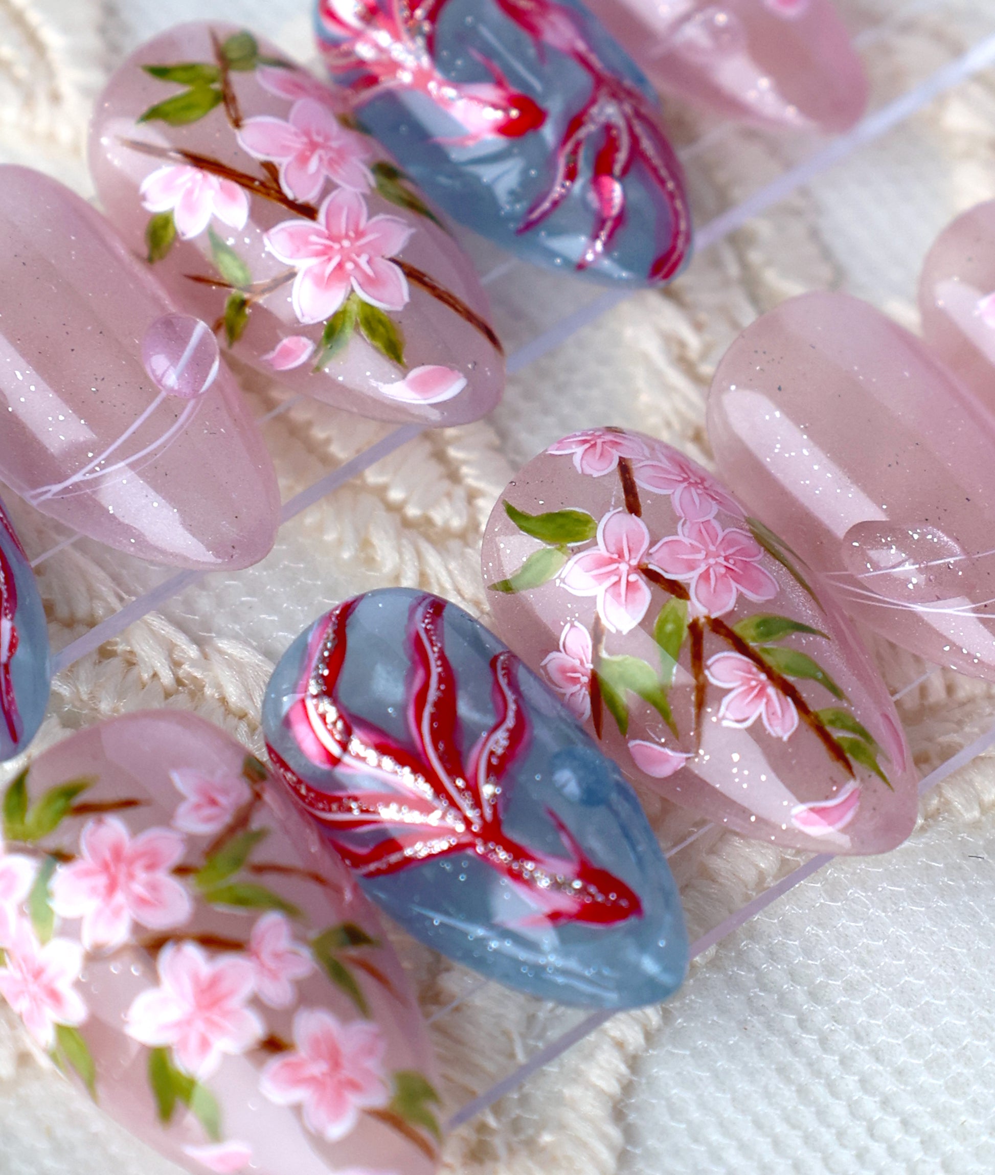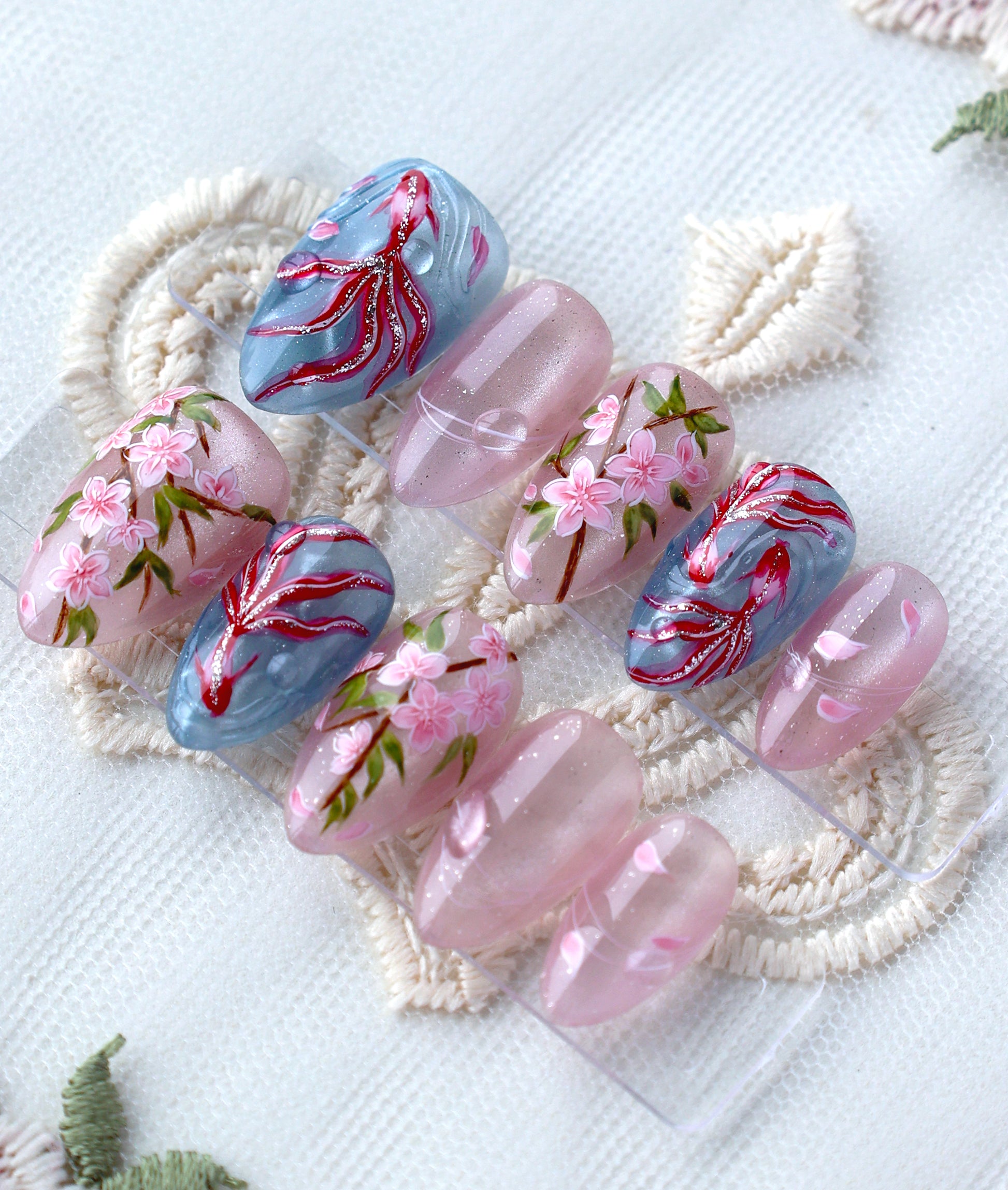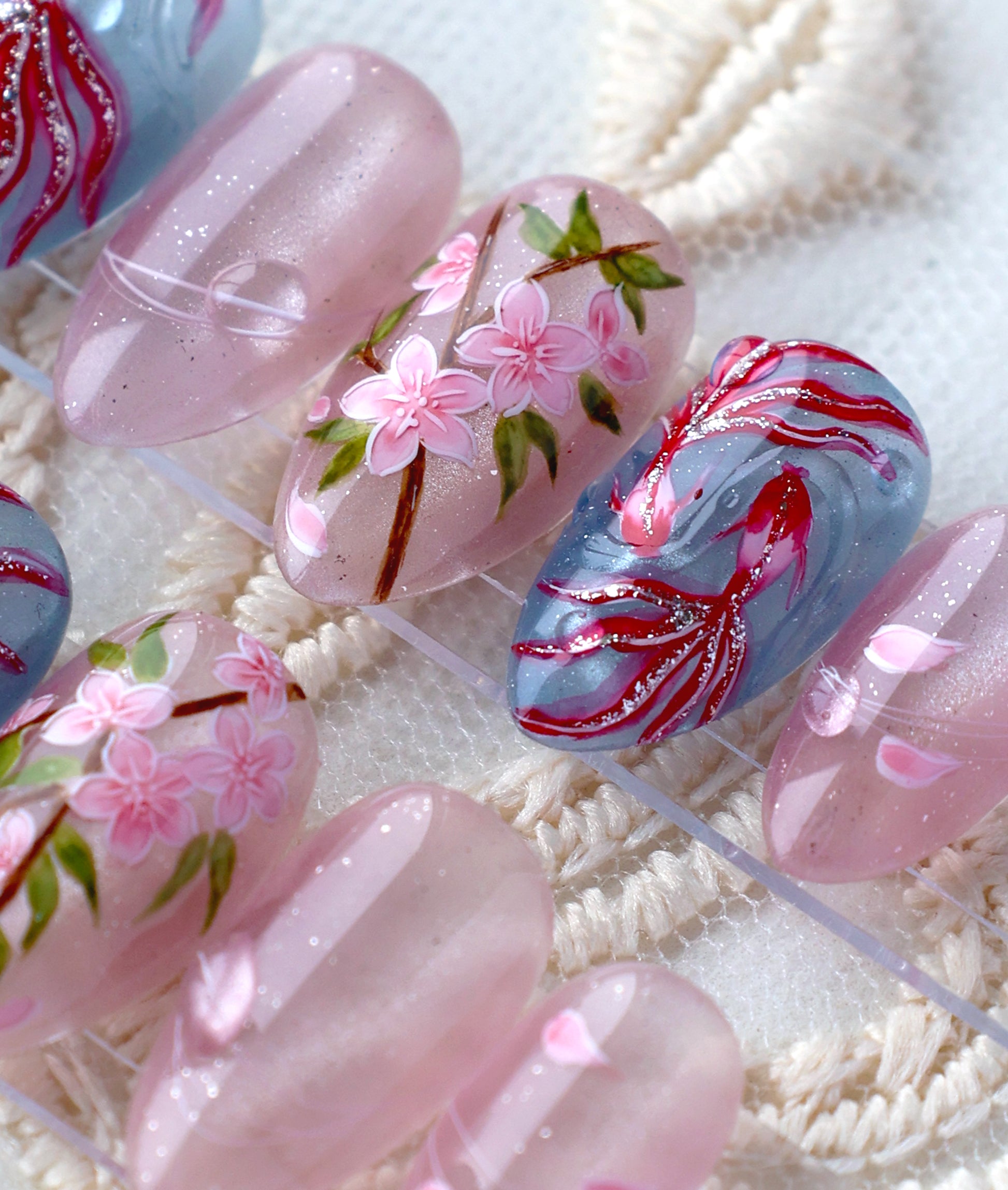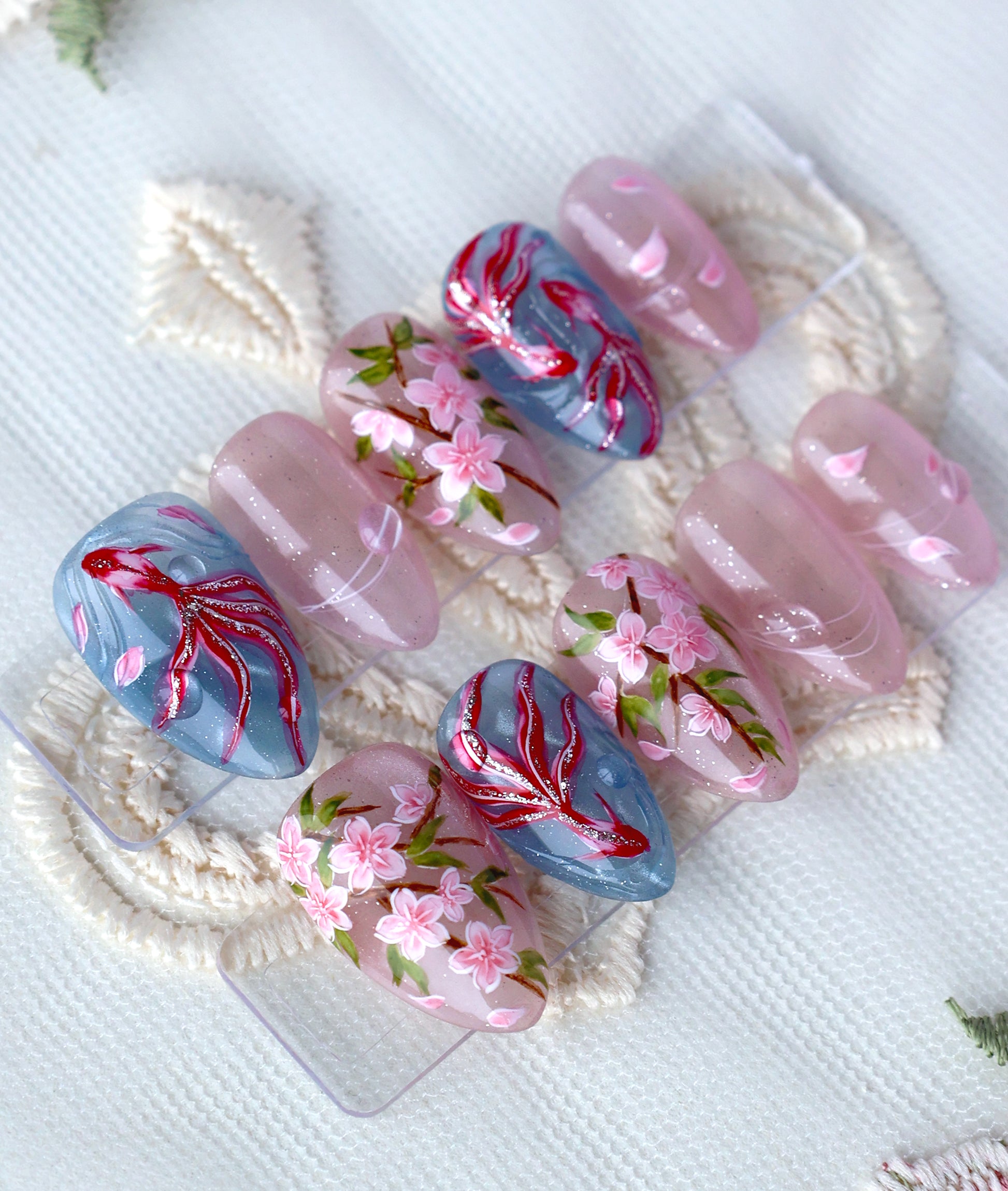 Let’s step into a hidden garden pond and feel the peaceful energy! This set features graceful koi fish gliding through shimmering cerulean water, paired with pink cherry blossoms in full bloom. Now elevate your spring and summer look with this hand-painted masterpiece!:)