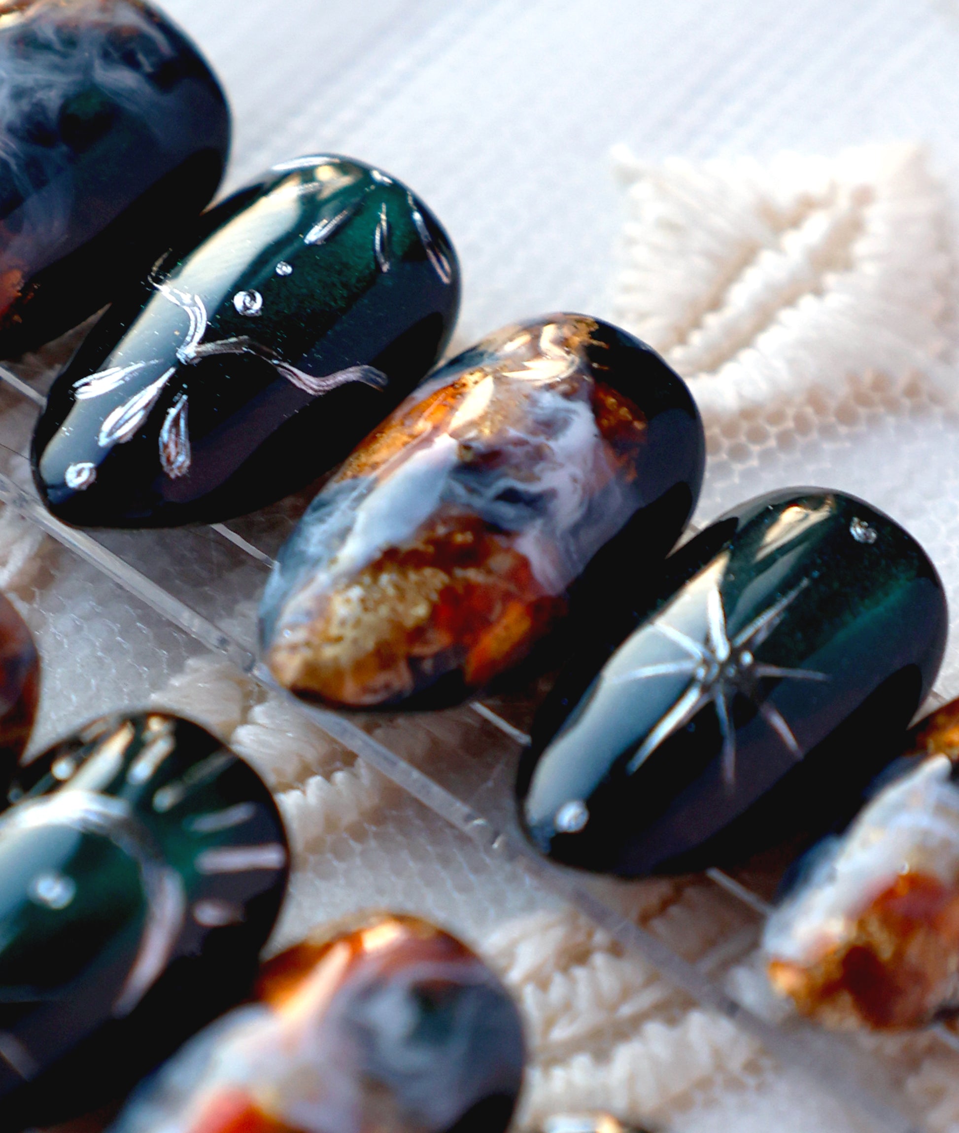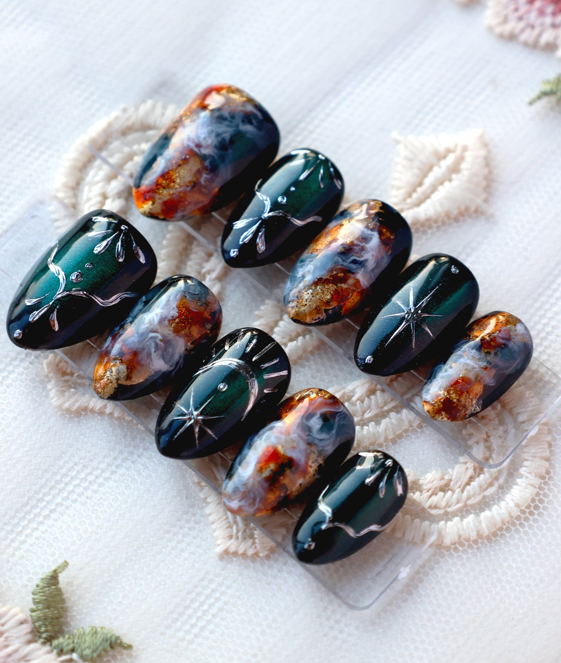 This set looks like a magical journey into an enchanted forest! You get deep emerald green nails, accented with elegant silver celestial designs that shimmer with every movement. Mixed with gorgeous marbling that swirls gold, copper, white, and smoky grey, reminiscent of mist over hidden mossy treasures, they’re perfect for anyone who feels at home among the trees and stars!:)