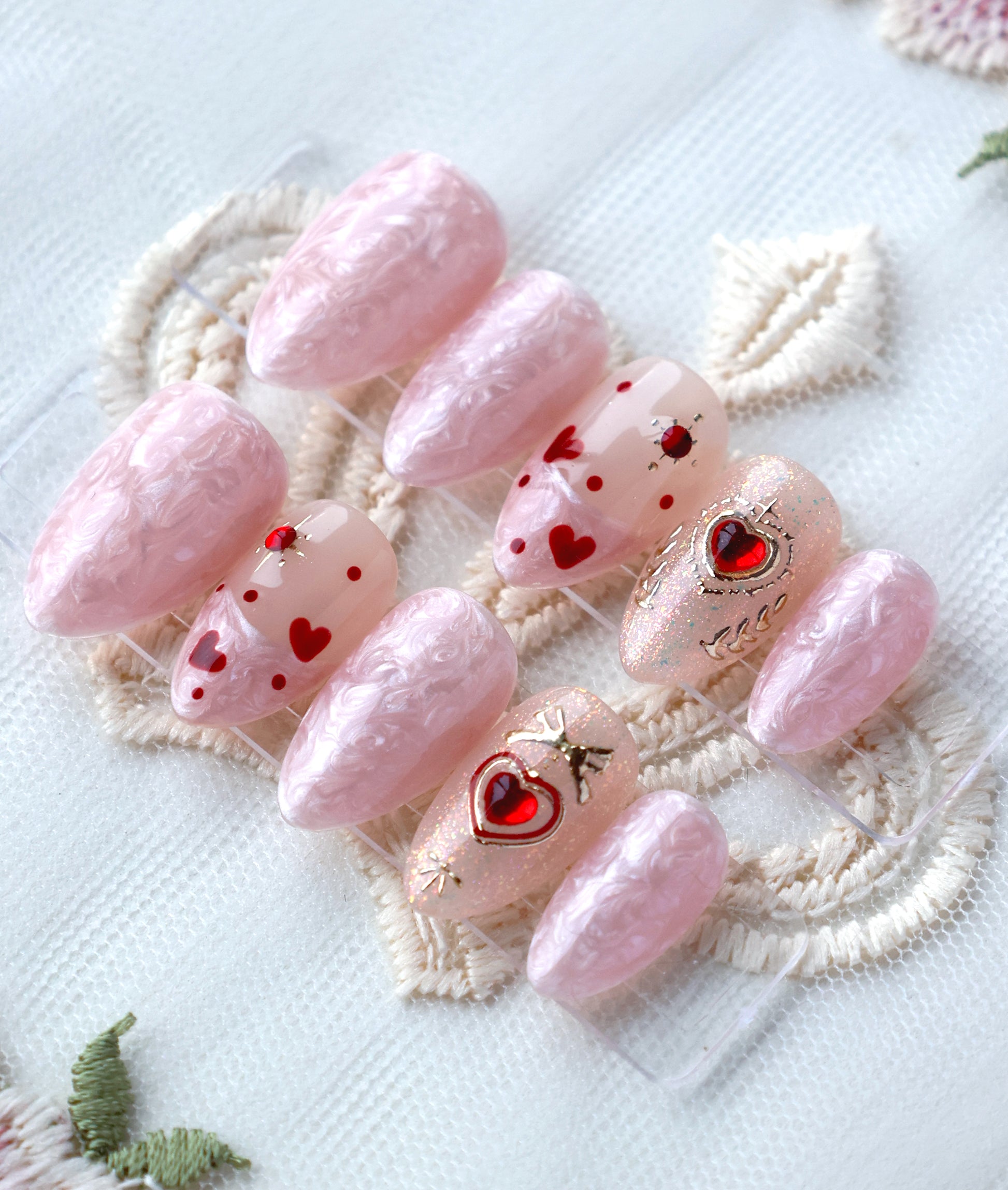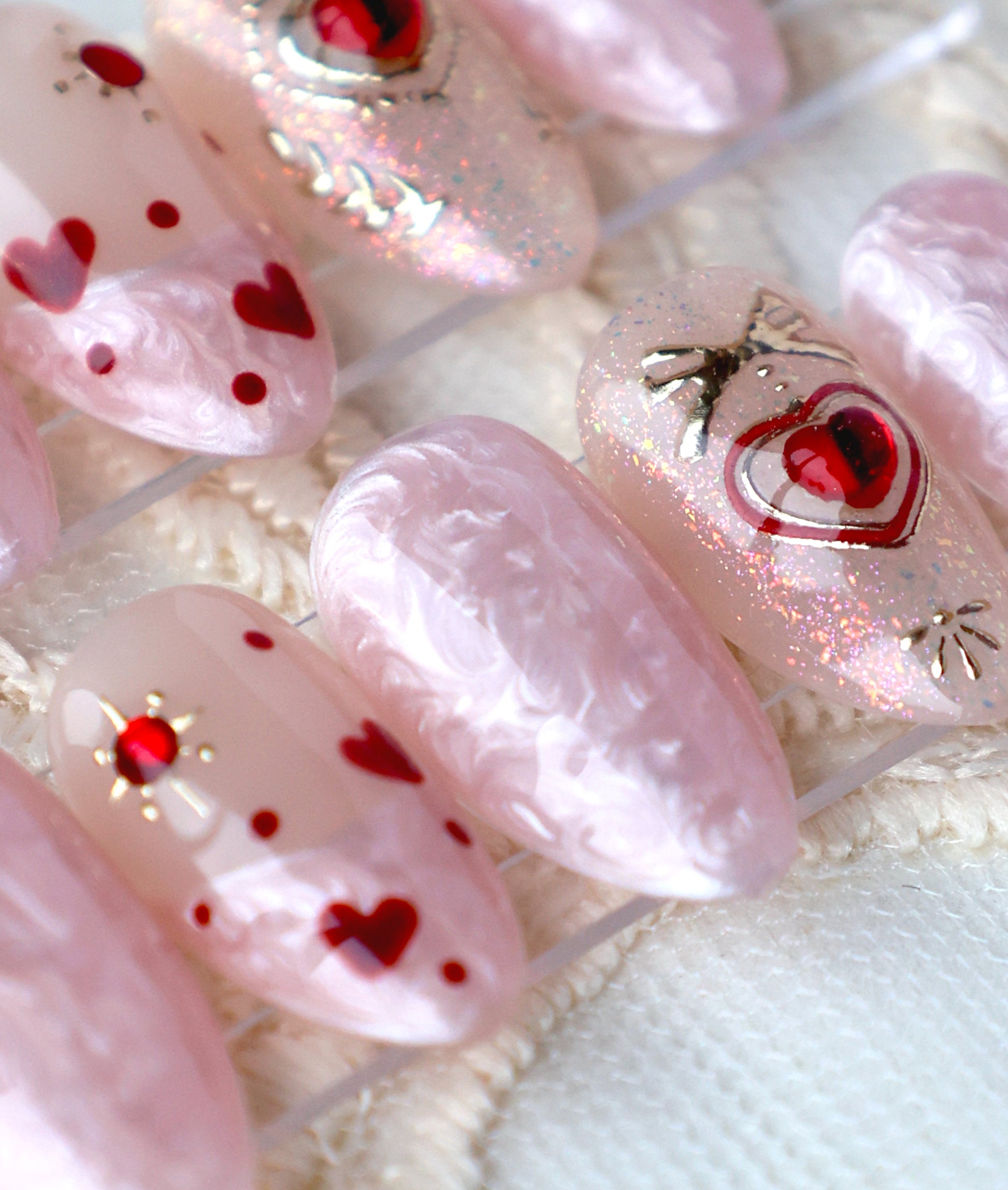 Get ready to wear your heart on your, well, your fingertips!:) Featuring pearly marble clouds, juicy red hearts, dainty gold bows, and sparkling gemstones, this set is definitely the perfect mix of "sweetheart" and "main character energy! Whether you're sipping a strawberry latte or heading out for a romantic date night, these nails are guaranteed to make everyone fall in love at first sight!