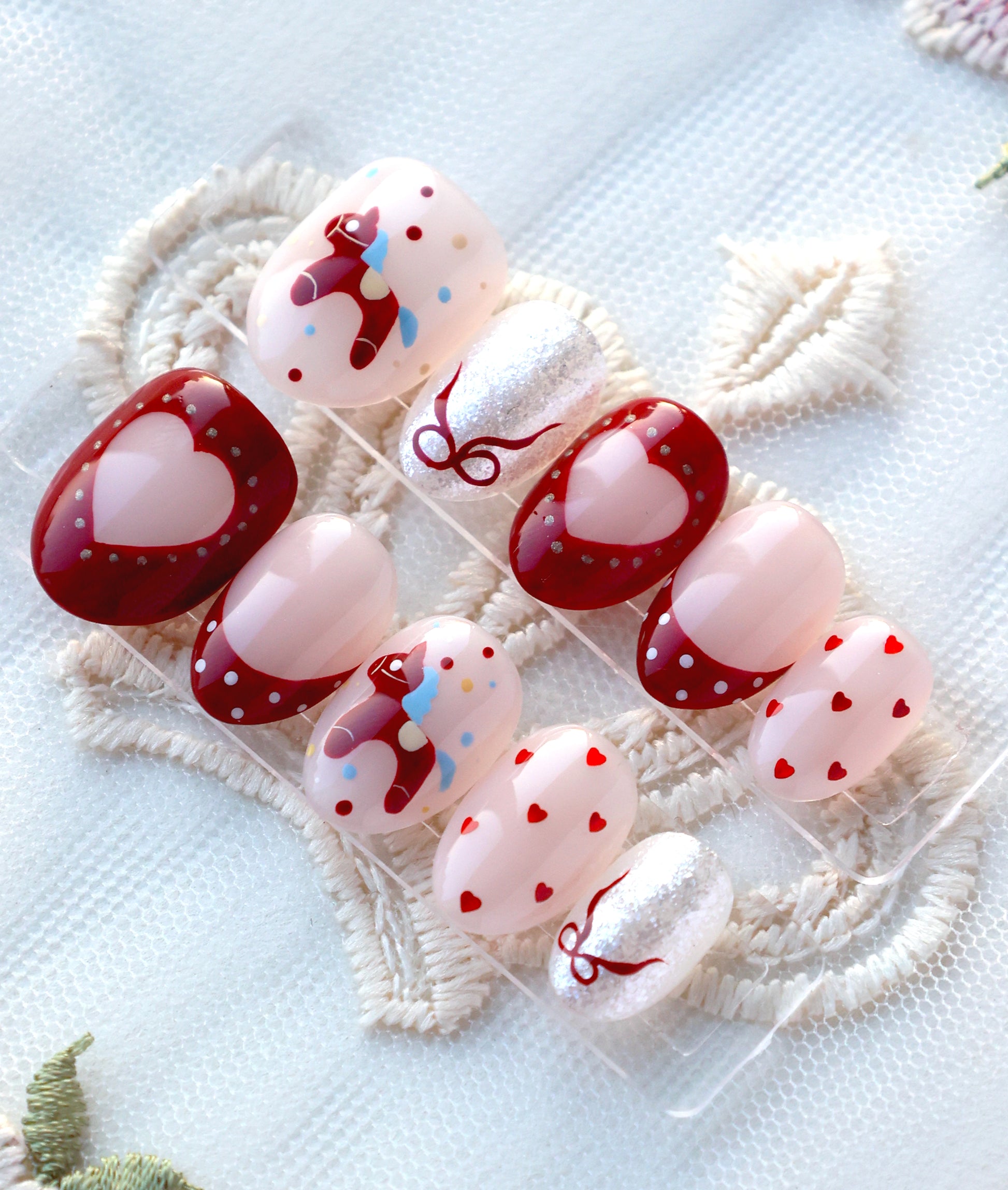 Double the luck, double the love! This set is a festive fusion of Lunar New Year luck and Valentine’s sweetness. Featuring adorable lucky ponies, polka-dot French tips, and shimmering heart windows, it’s designed to bring you all the good vibes and romance of the season!